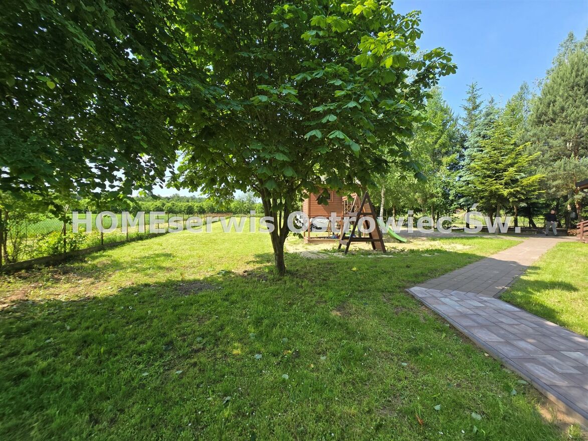 Na terenie posesji znajduje się duże oczko wodne, duży grill w kształcie koła, domek z drewna dla dzieci z piaskownicą, drewutnia i magazynek metalowy. Do budynku prowadzi długa alejka wyznaczona przez szpaler drzew, na terenie posesji wiele starych drzew liściastych i iglastych.